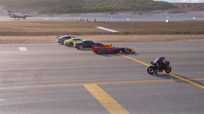 Las carreras de aceleración siempre son muy apetecibles de ver y más si los contendientes son tan variopintos como los protagonistas de este vídeo: un Tesla Model S, una Kawasaki H2R (la única moto de serie actual sobrealimentada), un monoplaza de Fórmula 1 de la escudería Red Bull, un caza de combate, un jet privado y dos deportivos se enfrentan en un drag de lo más curioso.