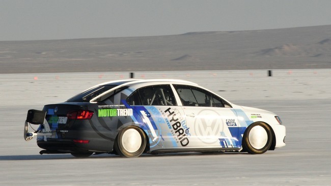 Sabedor el Grupo VAG de que lleva años de retraso en la carrera de los híbridos, lo ha querido compensar batiendo el récord mundial de velocidad… en categoría inferior a 1.500 cc. Para ello han partido de un Volkswagen Jetta Hybrid y lo han tuneado un poquito. De serie tiene un 1.4 TSI de 150 CV y 27 CV de ayuda eléctrica.