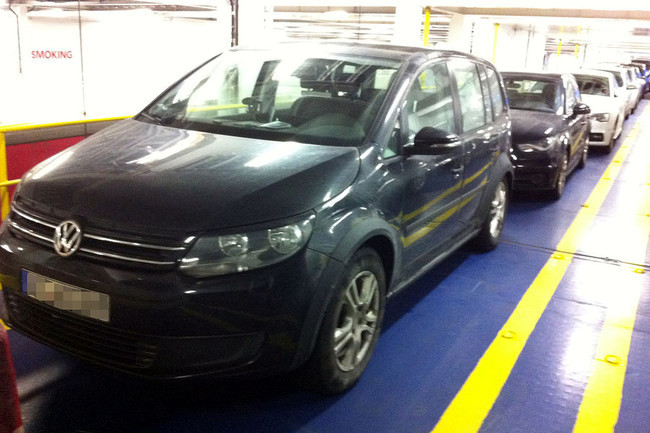 Esta imagen viene de un _ferry_ que se dirige a las gélidas tierras de Escandinavia. Un ojo entrenado dirá que es igual al "Touran 2010":https://www.motorpasion.com/volkswagen/nuevo-volkswagen-touran, pero es cierto a medias. Los ensanches de rueda le delatan, es una "mula" de pruebas, cáscara de modelo actual con retoques estéticos menores, pero con importantes modificaciones mecánicas.